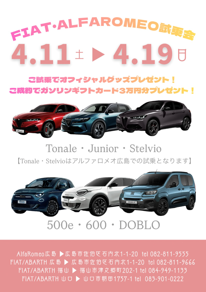 こんにちは! フィアット/アバルト広島です😊本日はFIAT試乗会についてのお知らせです👏👏